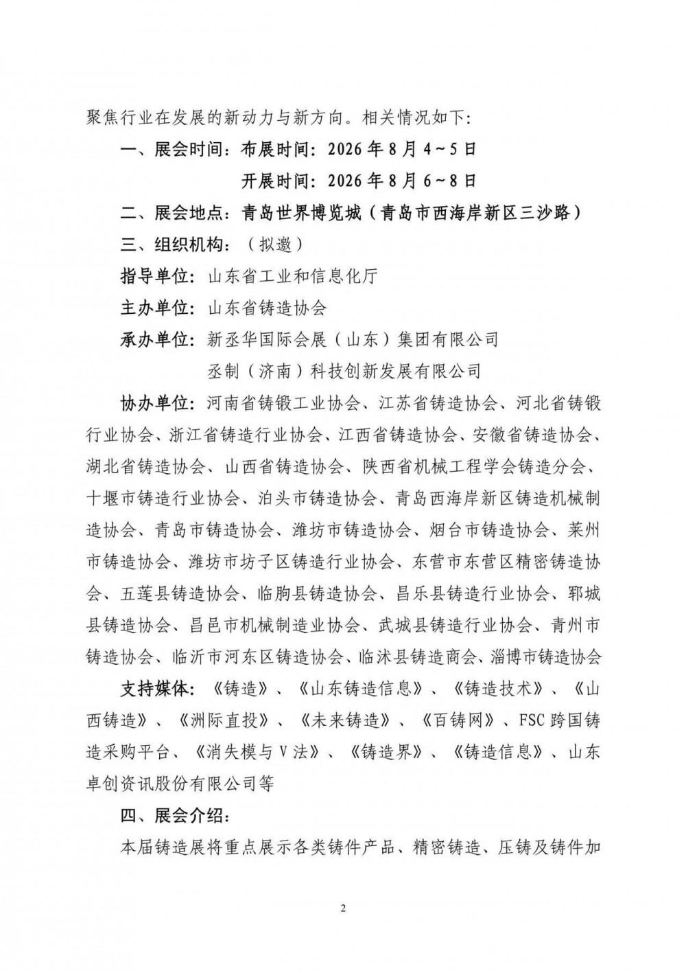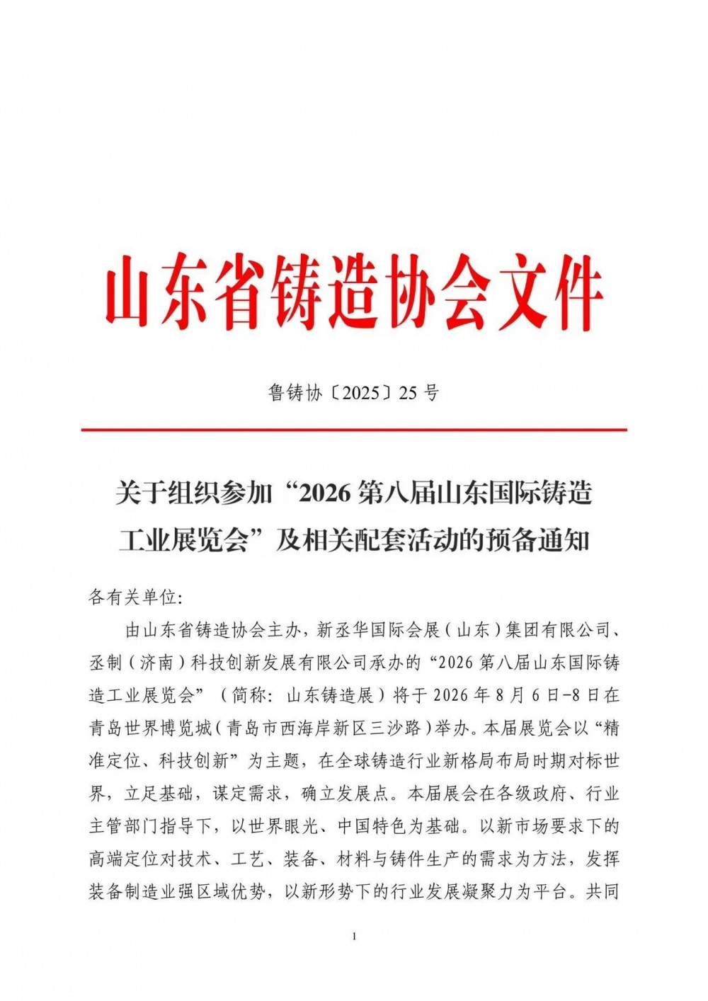 山东省铸造协会近日发布通知,2026第八届山东国际铸造工业展览会将于2026年8月6日至8日在青岛世界博览城举办,展会以“精准定位、科技创新”为主题,同期还将举办铸造行业新质生产力发展座谈会、新能源汽车轻量化部件产业链论坛等十余项配套活动,目前参展与参观预报名工作已正式启动。