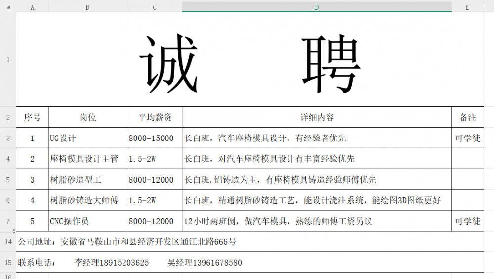 安徽省马鞍山市和县招聘树脂砂铸造大师傅