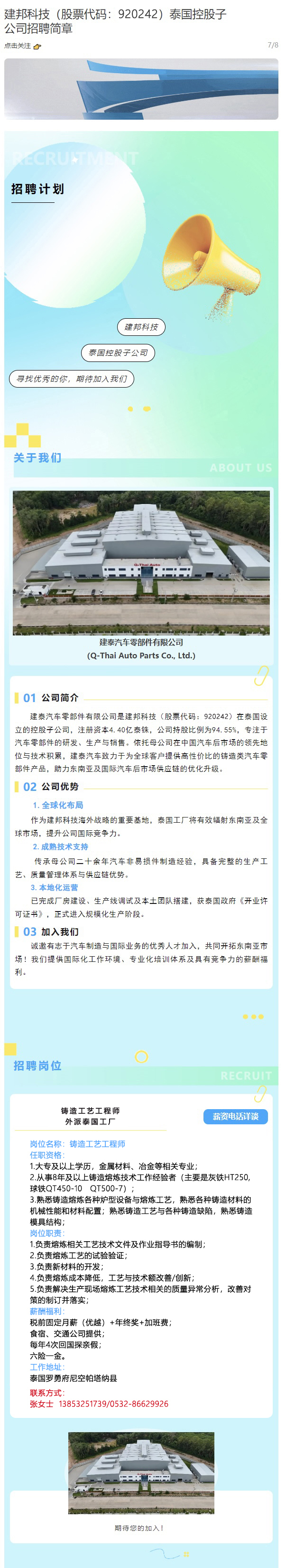 建邦科技泰国工厂铸造熔炼工程师招聘