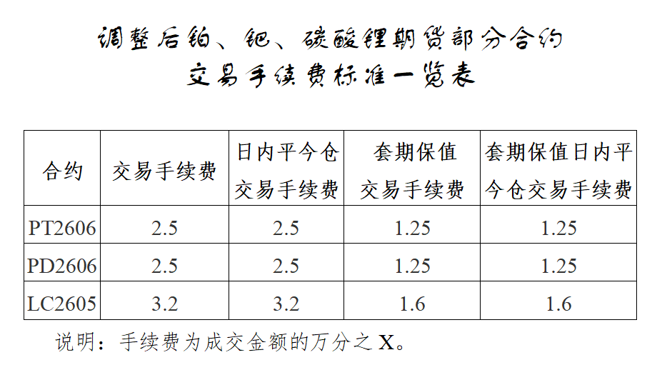 12月23日,广期所公告,经研究决定,对铂、钯、碳酸锂期货相关合约的交易手续费标准、涨跌停板幅度和交易保证金标准作如下调整:自2025年12月25日交易时起,铂期货PT2606合约、钯期货PD2606合约的交易手续费标准调整为成交金额的万分之二点五,日内平今仓交易手续费标准调整为成交金额的万分之二点五;碳酸锂期货LC2605合约的交易手续费标准调整为成交金额的万分之三点二,日内平今仓交易手续费标准调整为成交金额的万分之三点二。