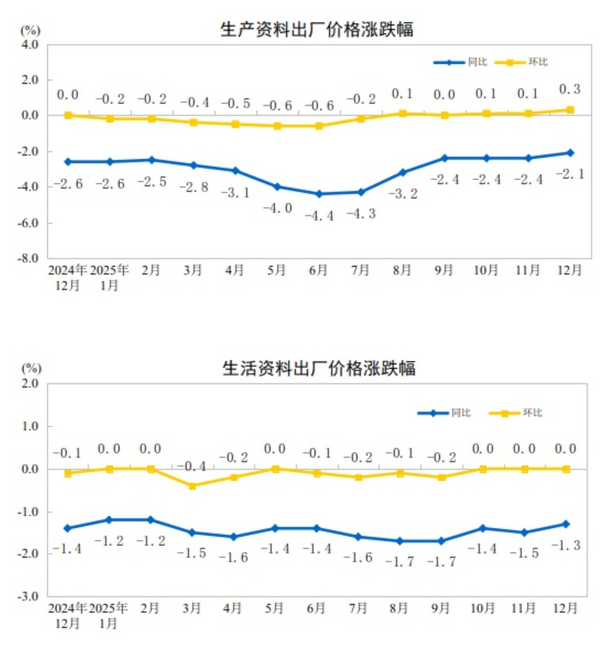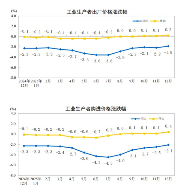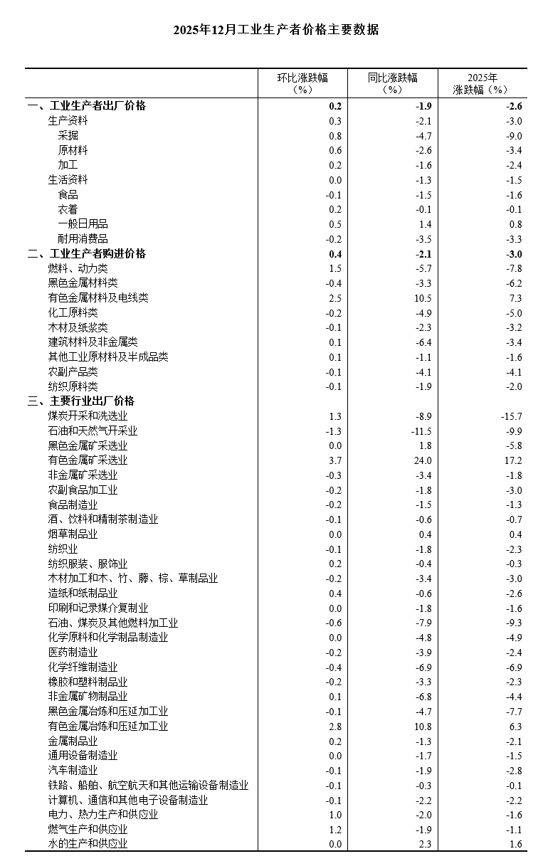 2025年12月份,全国工业生产者出厂价格同比下降1.9%,降幅比上月收窄0.3个百分点;环比上涨0.2%,涨幅比上月扩大0.1个百分点。工业生产者购进价格同比下降2.1%,降幅比上月收窄0.4个百分点;环比上涨0.4%,涨幅比上月扩大0.3个百分点。2025年全年,工业生产者出厂价格下降2.6%,工业生产者购进价格下降3.0%。