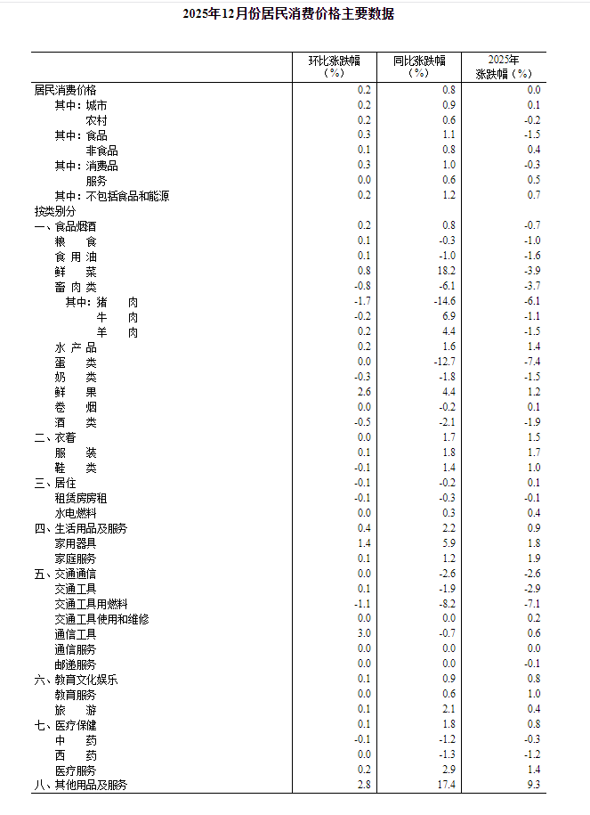 2025年12月份,全国居民消费价格同比上涨0.8%。其中,城市上涨0.9%,农村上涨0.6%;食品价格上涨1.1%,非食品价格上涨0.8%;消费品价格上涨1.0%,服务价格上涨0.6%。