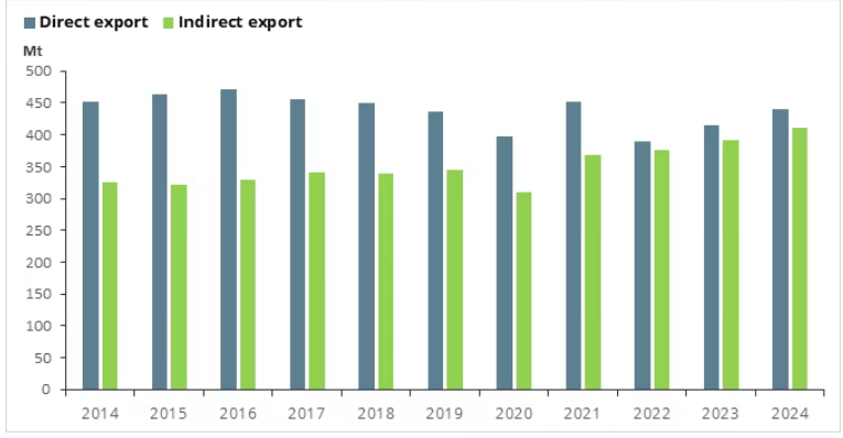 2014年至2024年期间,74个国家的钢铁间接出口量从2014年的3.25亿吨增至2024年的4.10亿吨,增幅为26%。2024年,钢铁间接贸易量相当于直接出口量的93%。