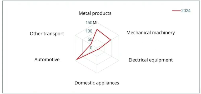 按行业划分的钢铁间接出口量(单位:百万吨(Mt),折合成成品钢量)