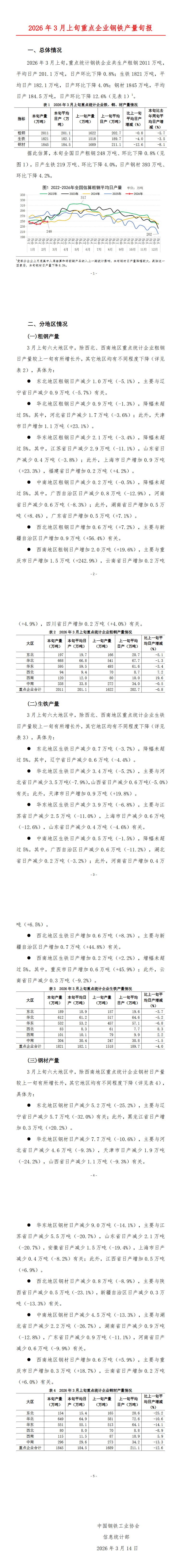 2026年3月上旬,重点统计钢铁企业共生产粗钢2011万吨,平均日产201.1万吨,日产环比下降0.8%;生铁1821万吨,平均日产182.1万吨,日产环比下降4.0%;钢材1845万吨,平均日产184.5万吨,日产环比下降12.6%。