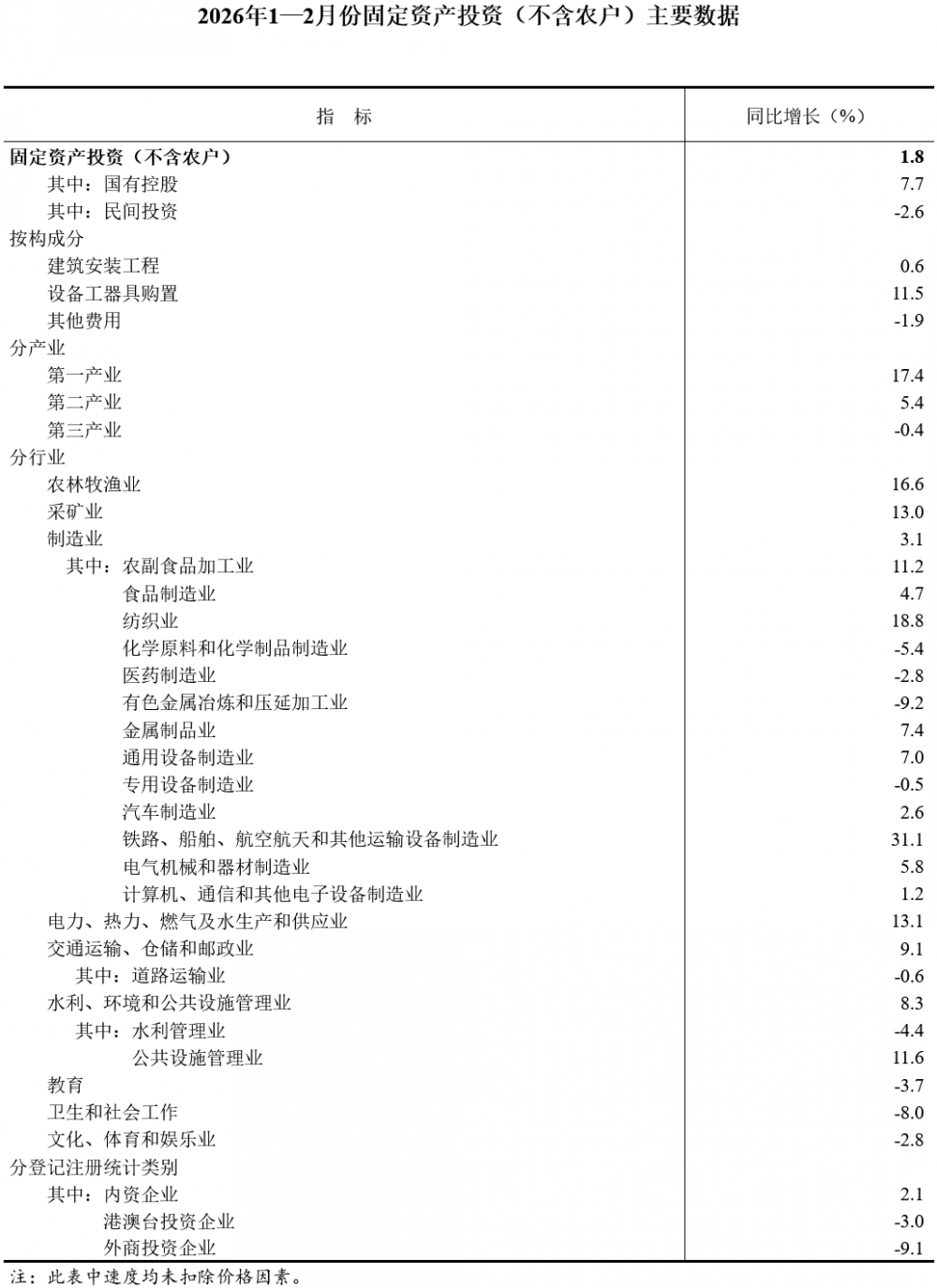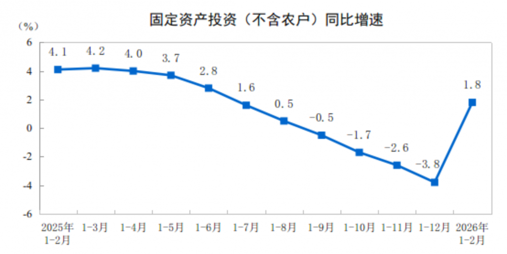 1—2月份,全国固定资产投资(不含农户)52721亿元,同比增长1.8%。其中,民间固定资产投资同比下降2.6%。从环比看,2月份固定资产投资(不含农户)增长0.39%。