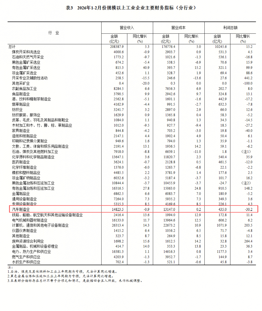 1—2月份,主要行业利润,汽车制造业下降30.2%。同期,汽车制造业营业收入同比下降0.9%;营业成本同比增长0.2%。