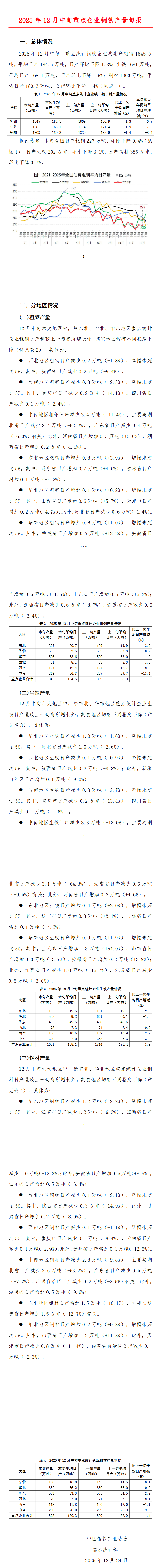 2025年12月中旬,重点统计钢铁企业共生产粗钢1845万吨,平均日产184.5万吨,日产环比下降1.3%;生铁1681万吨,平均日产168.1万吨,日产环比下降1.9%;钢材1803万吨,平均日产180.3万吨,日产环比下降1.4%。