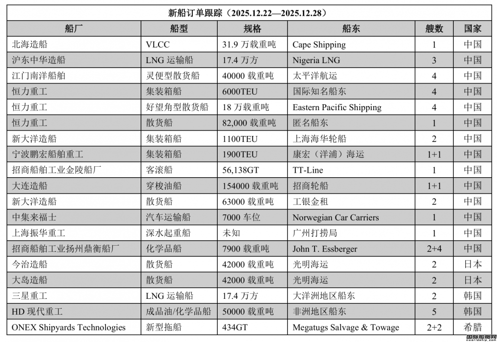 据国际船舶网跟踪:2025年12月22日至2025年12月28日,全球船厂共接获41+8艘新船订单。其中中国船厂接获28+6艘新船订单;日本船厂接获4艘新船订单;韩国船厂接获7艘新船订单;希腊船厂也接获相关新船订单。