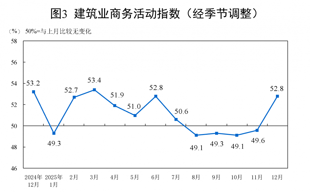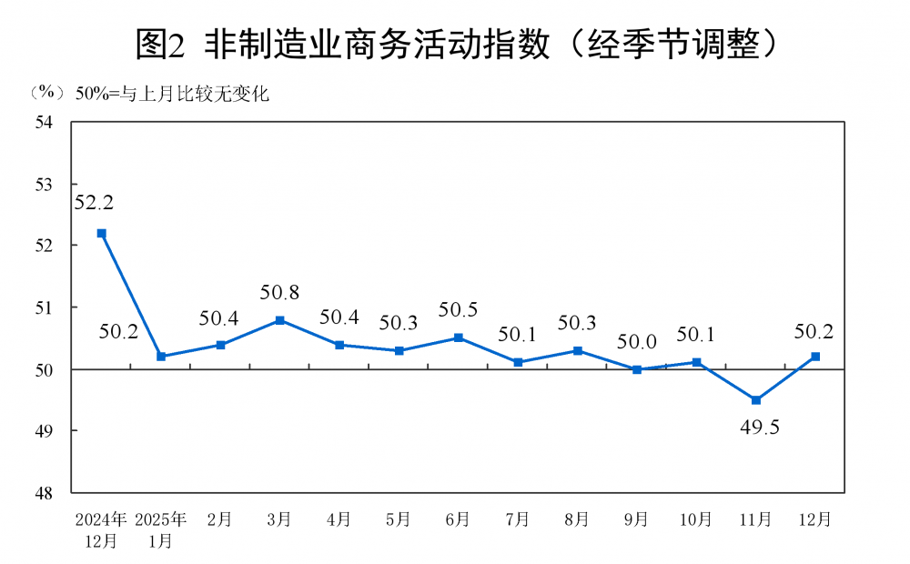 12月份,非制造业商务活动指数为50.2%,比上月上升0.7个百分点,重返扩张区间。