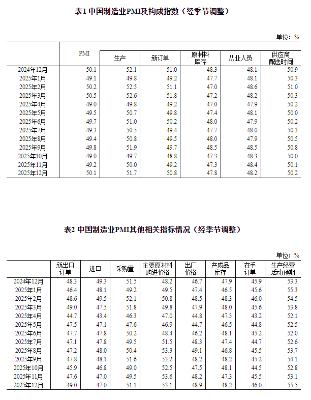 12月份,制造业采购经理指数(PMI)为50.1%,比上月上升0.9个百分点,升至扩张区间。