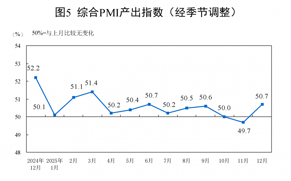 12月份,综合PMI产出指数为50.7%,比上月上升1.0个百分点,表明我国企业生产经营活动总体较上月扩张。