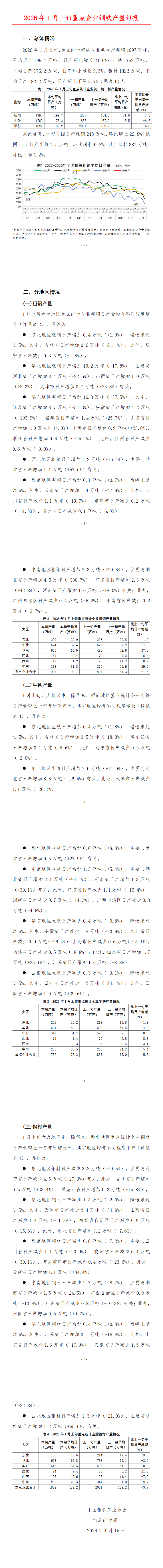 2026年1月上旬,重点统计钢铁企业共生产粗钢1997万吨,平均日产199.7万吨,日产环比增长21.6%;生铁1762万吨,平均日产176.2万吨,日产环比增长5.5%;钢材1822万吨,平均日产182.2万吨,日产环比下降3.7%。