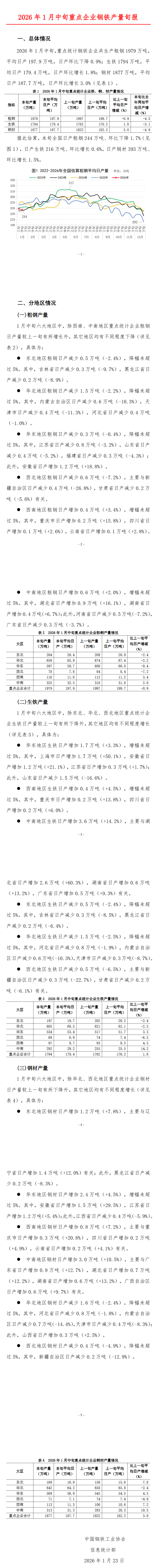 2026年1月中旬,重点统计钢铁企业共生产粗钢1979万吨,平均日产197.9万吨,日产环比下降0.9%;生铁1794万吨,平均日产179.4万吨,日产环比增长1.8%;钢材1877万吨,平均日产187.7万吨,日产环比增长3.0%。