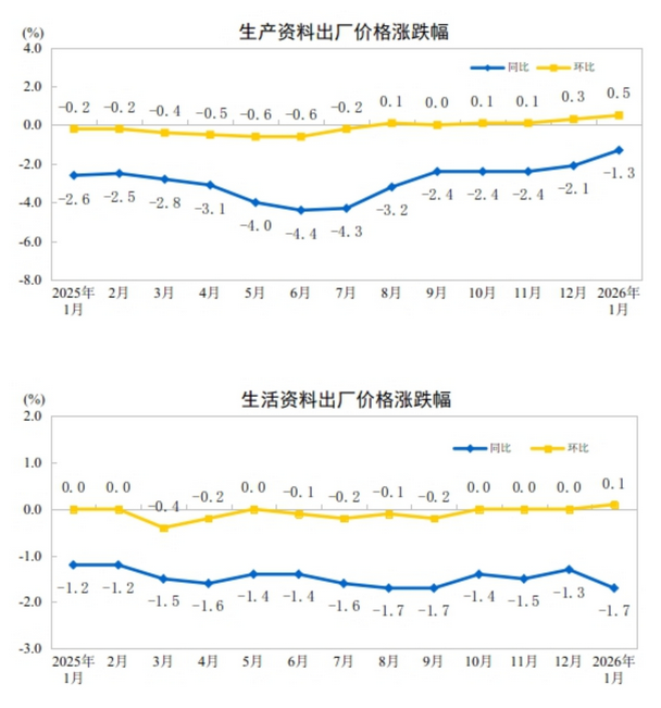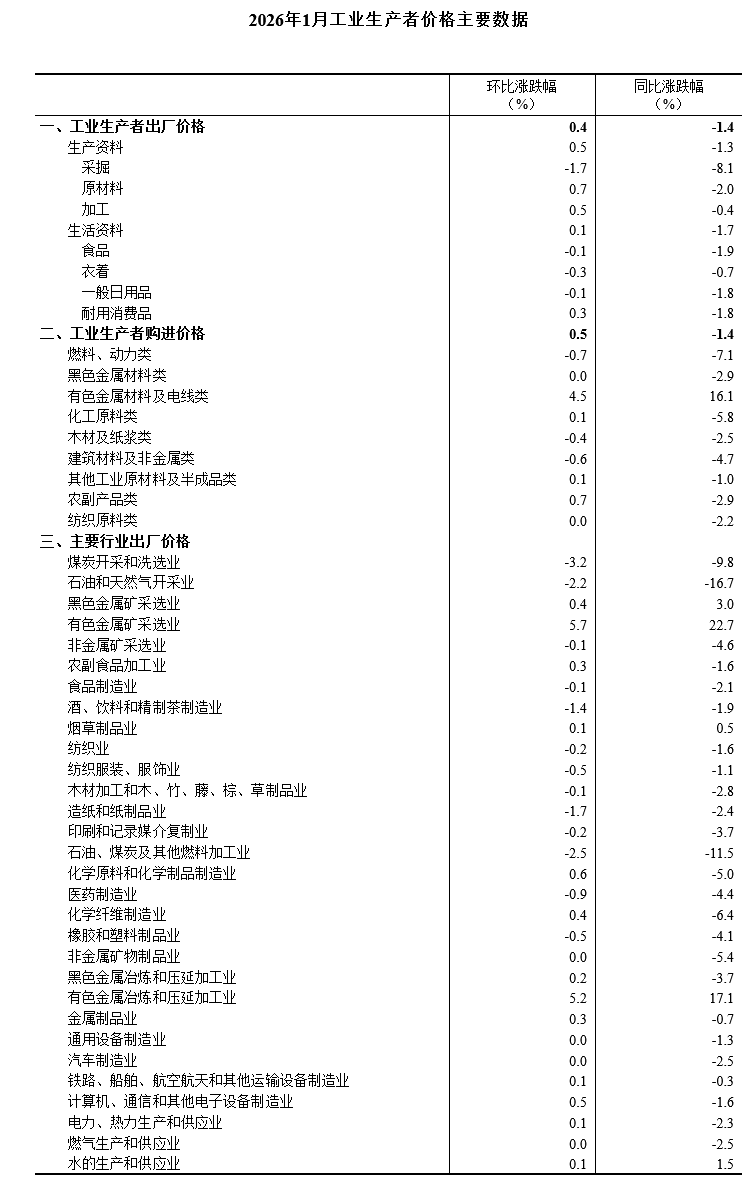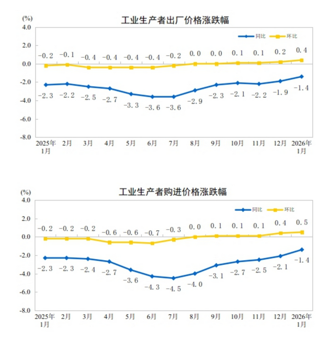 2026年1月份,全国工业生产者出厂价格同比下降1.4%,降幅比上月收窄0.5个百分点;环比上涨0.4%,涨幅比上月扩大0.2个百分点。工业生产者购进价格同比下降1.4%,降幅比上月收窄0.7个百分点;环比上涨0.5%,涨幅比上月扩大0.1个百分点。