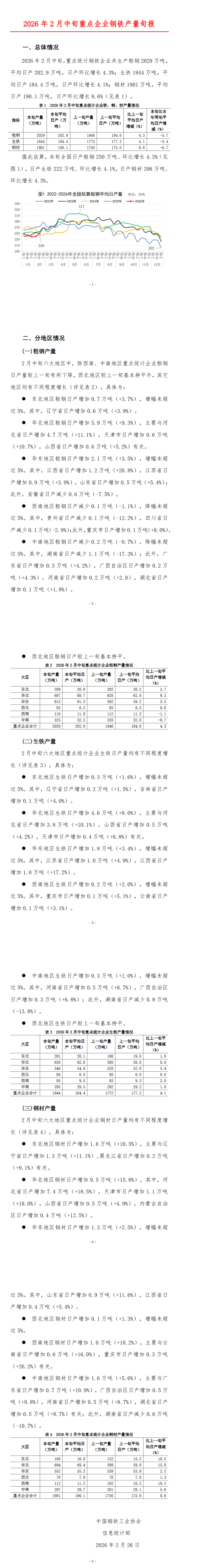 2026年2月中旬,重点统计钢铁企业共生产粗钢2029万吨,平均日产202.9万吨,日产环比增长4.3%;生铁1844万吨,平均日产184.4万吨,日产环比增长4.1%;钢材1901万吨,平均日产190.1万吨,日产环比增长8.6%。