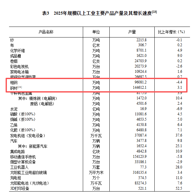 其中,2025年中国粗钢产量96081.2万吨,同比下降4.4%;钢材产量144612.1万吨,同比增长3.1%。