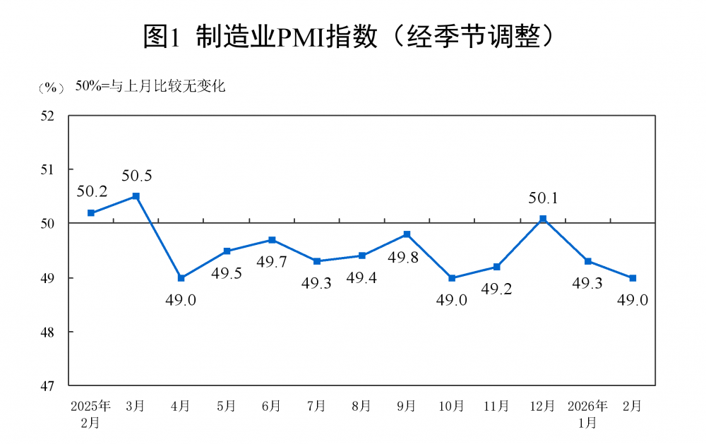 2月份,制造业采购经理指数(PMI)为49.0%,比上月下降0.3个百分点,制造业景气水平有所回落。