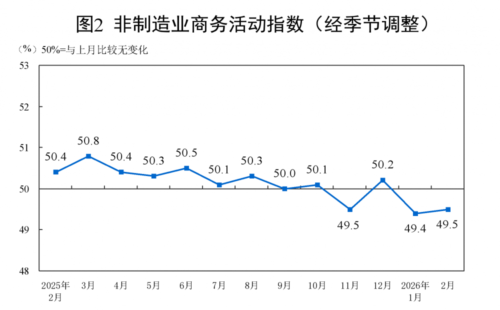 2月份,非制造业商务活动指数为49.5%,比上月上升0.1个百分点,非制造业景气水平有所改善。