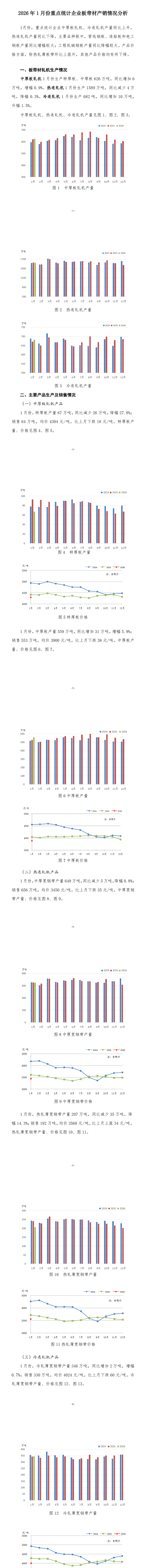 1月份,重点统计企业中厚板轧机、冷连轧机产量同比上升,热连轧机产量同比下降。其中中厚板轧机1月生产特厚板、中厚板626万吨,同比增加6万吨,增幅0.9%。热连轧机1月生产1589万吨,同比减少4万吨,降幅0.3%。冷连轧机1月生产682万吨,同比增加10万吨,升幅1.5%。