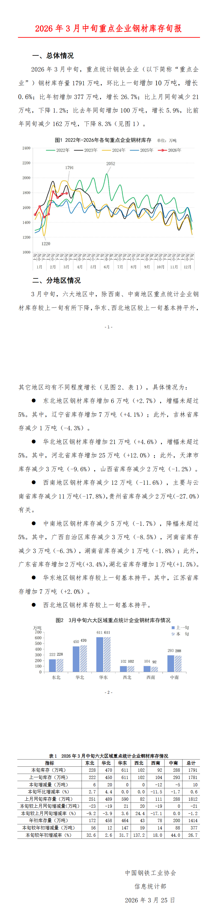 2026年3月中旬,重点统计钢铁企业钢材库存量1791万吨,环比上一旬增加10万吨,增长0.6%;比年初增加377万吨,增长26.7%;比上月同旬减少21万吨,下降1.2%;比去年同旬增加100万吨,增长5.9%,比前年同旬减少162万吨,下降8.3%。
