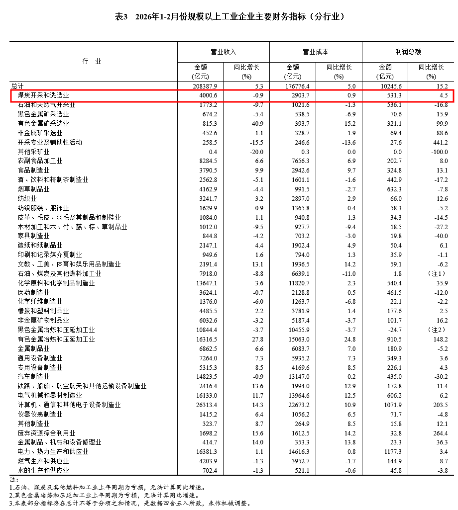 1—2月份,煤炭开采和洗选业实现利润总额531.3亿元,同比增长4.5%。