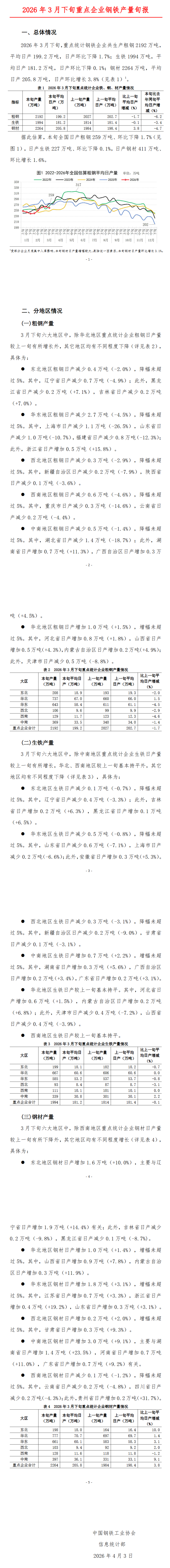 2026年3月下旬,重点统计钢铁企业共生产粗钢2192万吨,平均日产199.2万吨,日产环比下降1.7%;生铁1994万吨,平均日产181.2万吨,日产环比下降0.1%;钢材2264万吨,平均日产205.8万吨,日产环比增长3.8%。