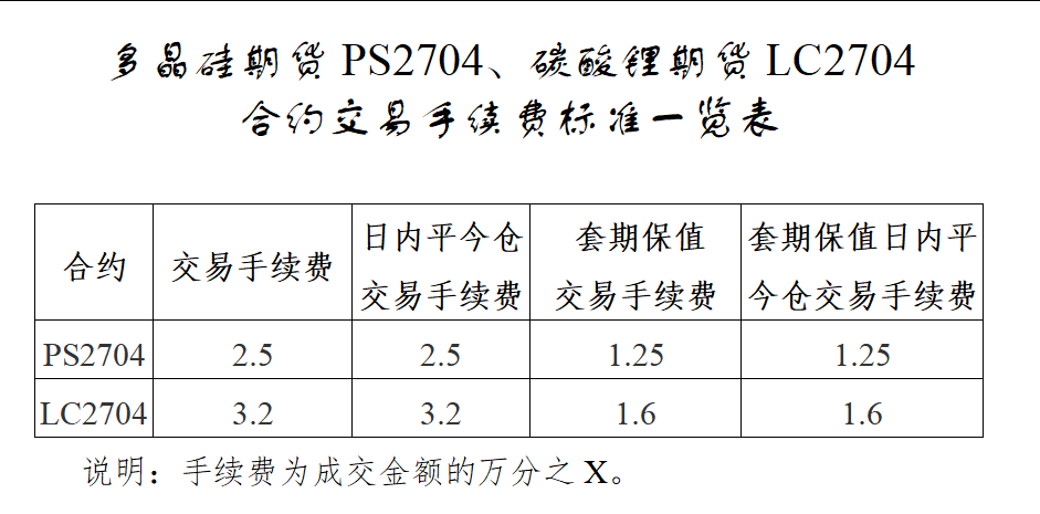 4月14日,广州期货交易所公告,经研究决定,现将多晶硅期货PS2704、碳酸锂期货LC2704合约有关事项公告如下:
