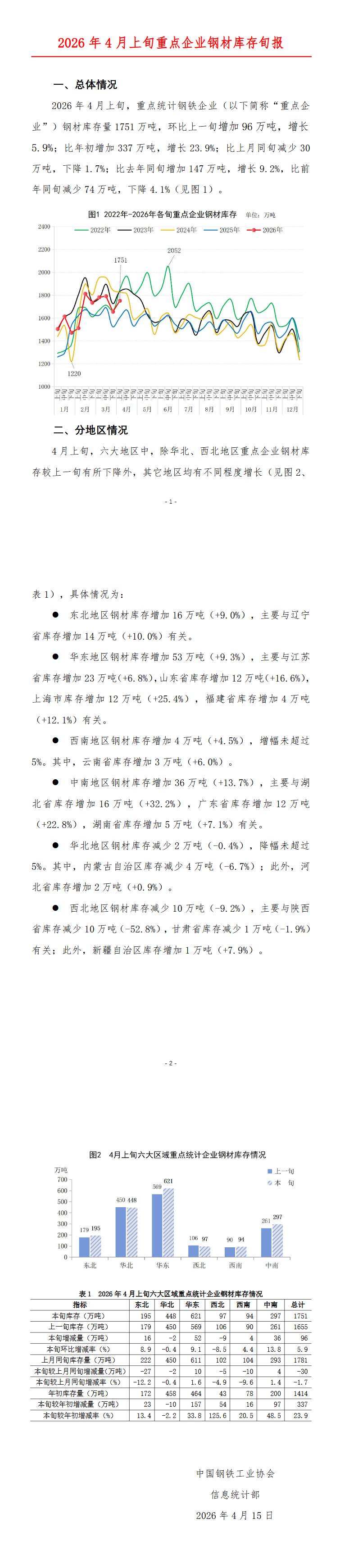2026年4月上旬,重点统计钢铁企业钢材库存量1751万吨,环比上一旬增加96万吨,增长5.9%;比年初增加337万吨,增长23.9%;比上月同旬减少30万吨,下降1.7%;比去年同旬增加147万吨,增长9.2%,比前年同旬减少74万吨,下降4.1%。