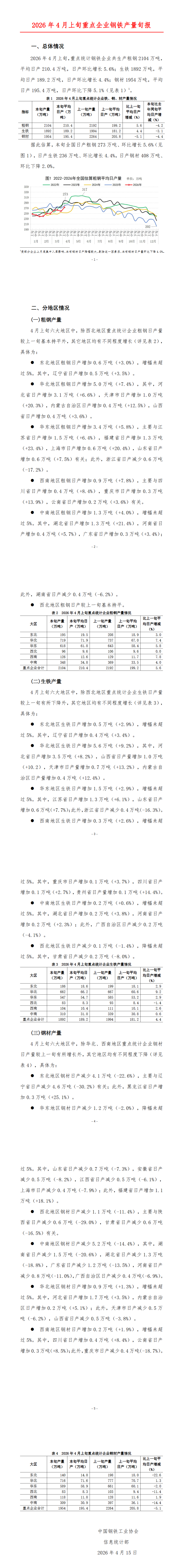 2026年4月上旬,重点统计钢铁企业共生产粗钢2104万吨,平均日产210.4万吨,日产环比增长5.6%;生铁1892万吨,平均日产189.2万吨,日产环比增长4.4%;钢材1954万吨,平均日产195.4万吨,日产环比下降5.1%。