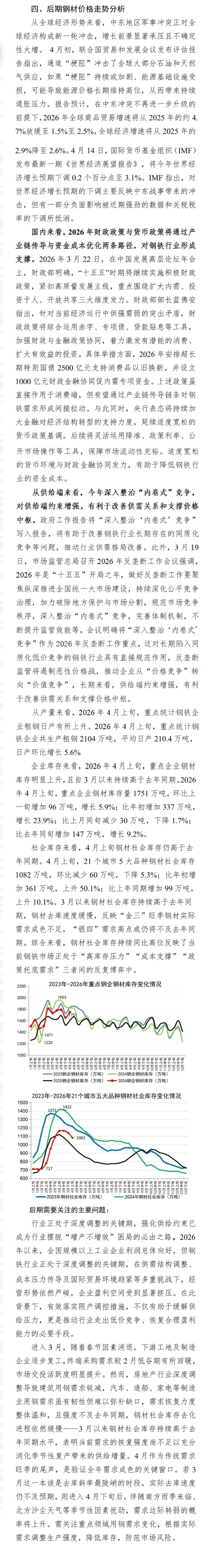 进入4月份,钢材价格继续小幅震荡,在需求无明显变化的情况下,需持续保持对原燃料市场价格的关注。