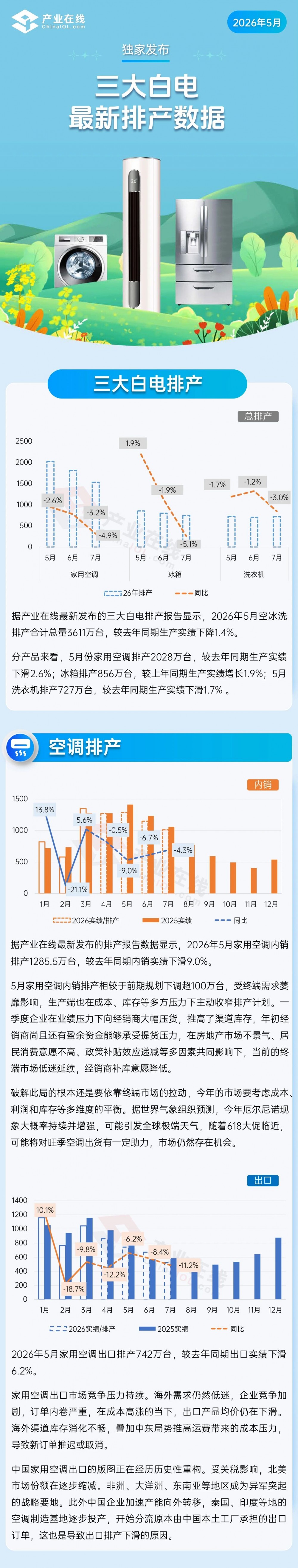 据产业在线最新发布的三大白电排产报告显示,2026年5月空冰洗排产合计总量3611万台,较去年同期生产实绩下降1.4%。
