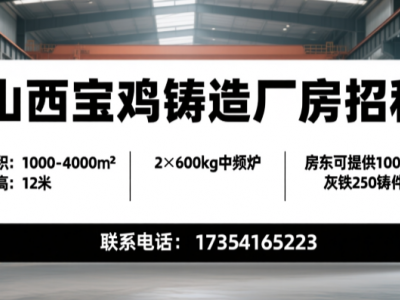陕西宝鸡铸造厂房出租,车间有2台600公斤的中频炉,2台10吨的行车,车间高度12米,客户厂区目前有1000平对外出租,如果客户有需要,可以调剂到4000平。另外房东可提供1000多吨灰铁250铸件产能。